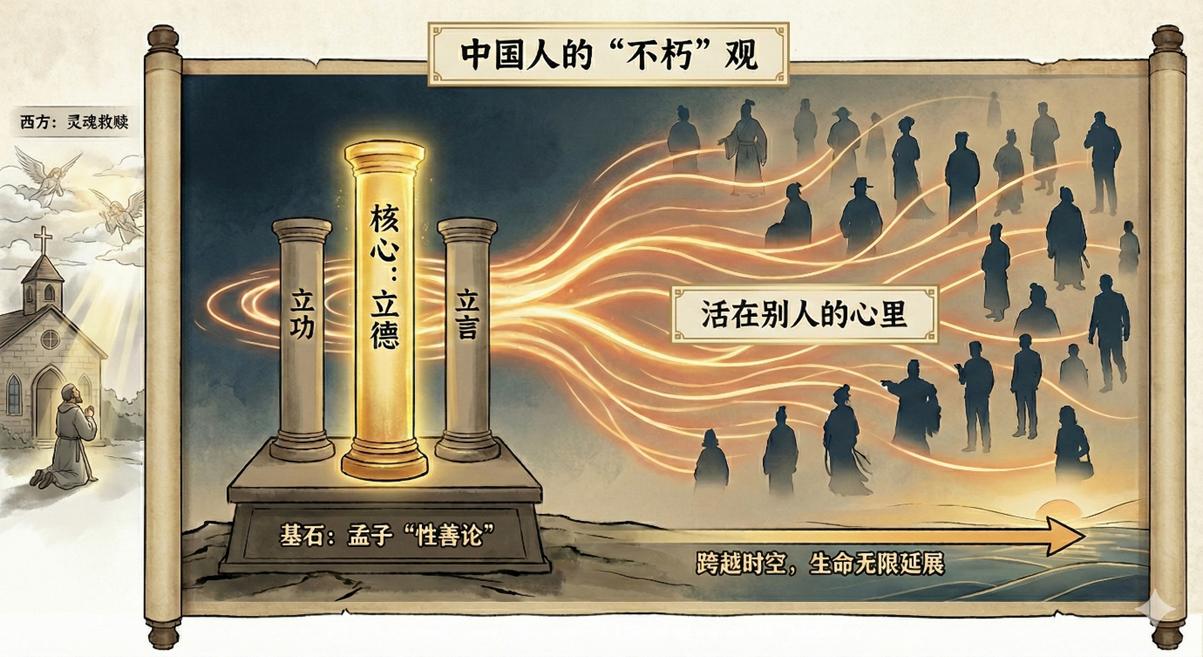 不朽观的基石是孟子的“性善论” 。正因“人性本善”,人类天性中有着共同的向善趋向,一个人的善举才能跨越时空,激起千万人心底的回响,从而在他人身上复活生命。这一信仰基于人性,超越了近代西方“唯物”与“唯心”的二元对立 。它不需要假设一个外在的主宰,也不仅仅停留在物质的层面,而是指出了一条通过不断提升自我道德修养,从而实现生命无限延展的道路。