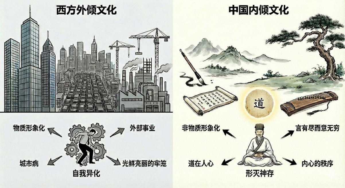与中国文化向内探求“道”的特质形成鲜明对照的,是西方文化的“外倾性”。近代西方文明集古希腊的自由主义、古罗马的团体组织与希伯来的宗教精神于一体,创造了令人叹为观止的物质成就 。这种吻合《易经》“开物成务”精神的文化,擅长通过认识自然规律来成就外部事业 。然而,它倾向于将精神客观化,使其凝固在建筑、城市与制度之中,最终形成一种独立于人,甚至压迫人的力量 。