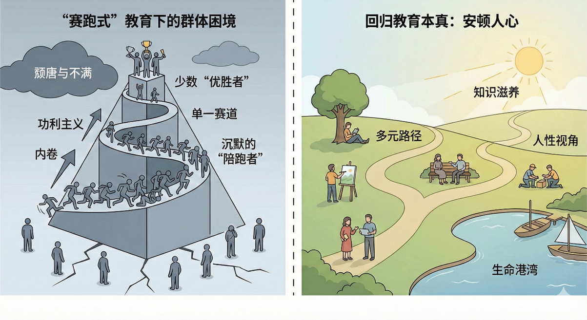 这种教育逻辑的残酷之处在于,它预设了跑道的单一与狭窄。赛道上的优胜者注定是凤毛麟角,而绝大多数人则沦为沉默的“失败者” 。当教育仅关注如何让少数人爬上金字塔尖,而忽视了广大“陪跑者”的内心感受时,那些被遗落在身后的人,不仅未能获得知识的滋养,反而滋生了颓唐、消极乃至破坏性的不满情绪 。
