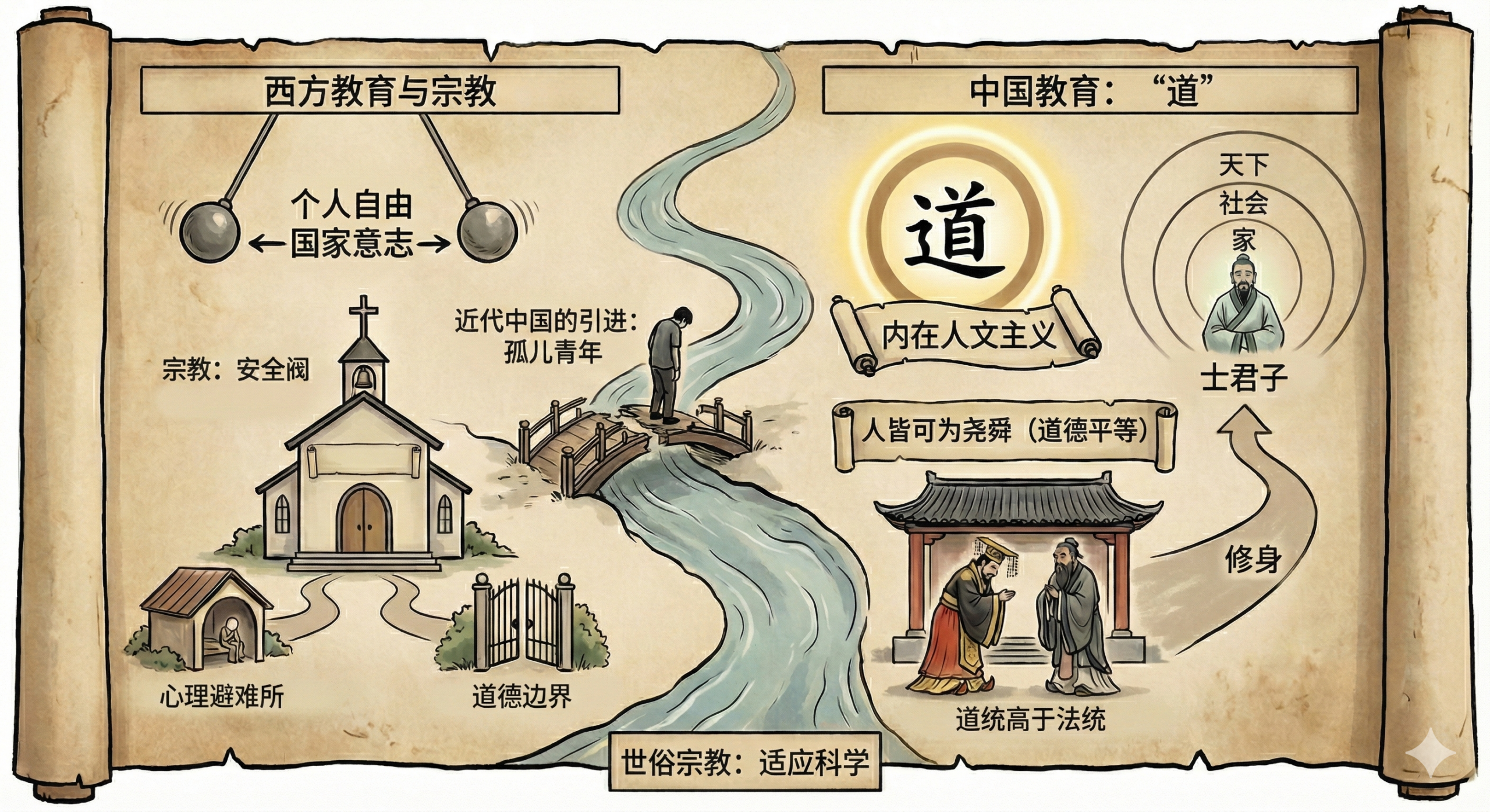 中国的“道”,代表了天下大众和民族文化的最高精神,它不由权势定义,而是源于每个人与生俱来的天性 。因此,在中国人的精神世界里,“道统”往往高于“法统” 。孔庙之中,即便是九五之尊的皇帝也要向孔子行礼,这象征着政治权力在文化与道德真理面前的谦卑,即,“尊师重道” 。这种“道”的教育,旨在培养“士君子”,即那类在道德与人格上自我完成的人 。它教导人们通过“修身、齐家、治国、平天下”,将“小我”融入家庭、社会乃至天下的“大我”之中 。