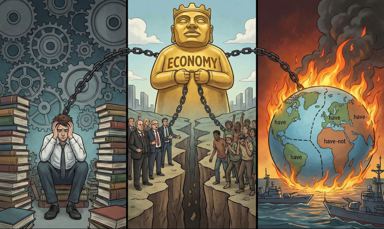 钱穆敏锐地察觉到,当一个时代将“经济”视为万物的尺度,奉之为某种神圣的决定性力量时,不仅无法达到预期的终极幸福,还将把人类文明推向深层的异化。笔者认为,这种“异化”并非孤立存在,而是发展为了一条环环相扣的“病态链”——从个体的精神失衡,蔓延至国家内部的阶级对立,最终演变为全球范围残酷的地缘冲突。